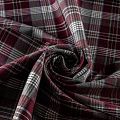 Ткань средней плотности, мягкая и приятная на ощупь, немного тянется, формоустойчива, хорошо драпируется и образует мягкие складки. Сочетание линий серого, синего и белого цветов на насыщенном винном фоне образует сложную красивую клетку тартан. Ткань отлично подойдет на костюмы, юбки, брюки, платья, жакеты.