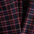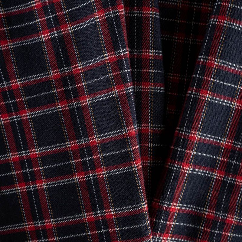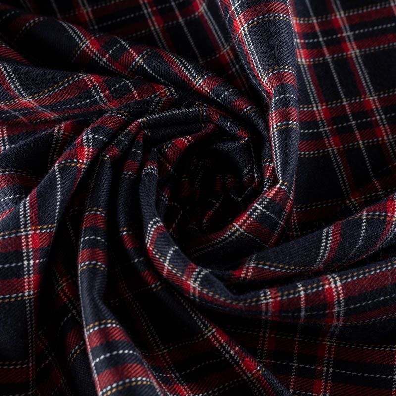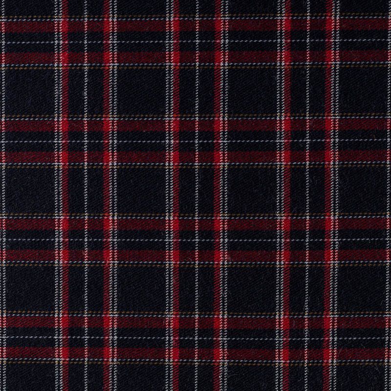 Ткань средней плотности, мягкая и приятная на ощупь, немного тянется, формоустойчива, хорошо драпируется и образует мягкие складки. Сочетание линий желтого, красного и белого цветов на глубоком синем фоне образует сложную красивую клетку тартан. Ткань отлично подойдет на костюмы, юбки, брюки, платья, жакеты.