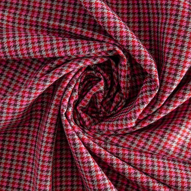Костюмная ткань с уже классическим узором пье-де-пуль (гусиная лапка) в розово-серых оттенках. Рисунок образован за счёт жаккардового переплетения нитей. Материал мягкий, плотный, благодаря эластану изделия идеально сядут по фигуре и будут очень комфортные. Рекомендуем для пошива костюма, жакета, шорт или юбки.
