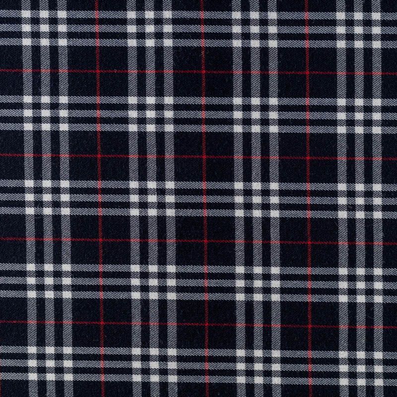 Ткань средней плотности, мягкая и приятная на ощупь, немного тянется, формоустойчива, хорошо драпируется и образует мягкие складки. Сочетание линий белого и красного цветов на темно-синем фоне образует сложную красивую клетку. Ткань отлично подойдет на костюмы, юбки, брюки, платья, жакеты, для школьной формы.