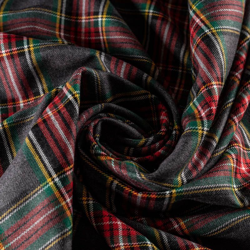 Ткань средней плотности, мягкая и приятная на ощупь, немного тянется, формоустойчива, хорошо драпируется и образует мягкие складки. Сочетание линий желтого, зеленого, черного и белого цветов на сером фоне образует сложную красивую клетку тартан. Ткань отлично подойдет на костюмы, юбки, брюки, платья, жакеты.