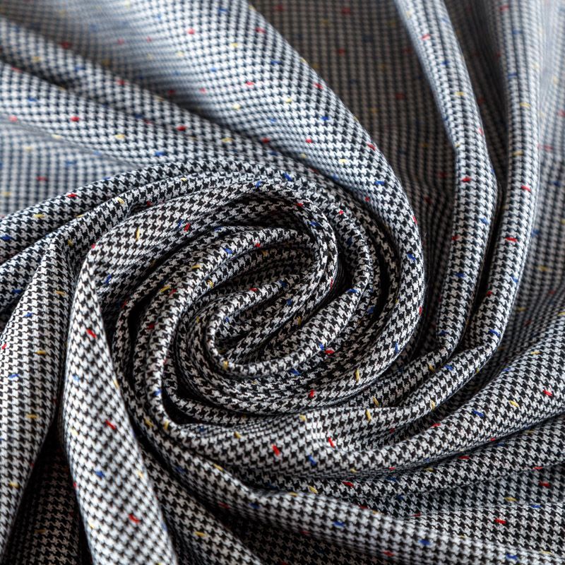 Костюмно-плательная ткань средней плотности с добавлением вискозы. Мягкая, пластичная, с мелким геометрическим принтом - гусиная лапка в черно-белой гамме. Полотно очень приятное на ощупь, не мнется, не сухое, отлично драпируется. Идеально подойдет для костюма, жакета или жилета, брюк, а также юбок и платьев.