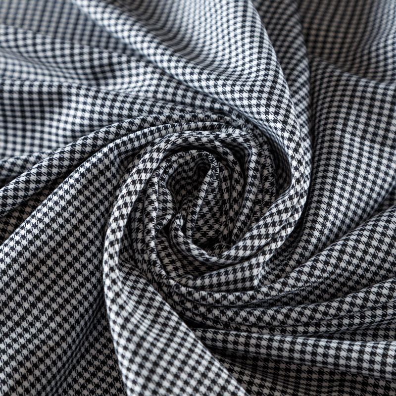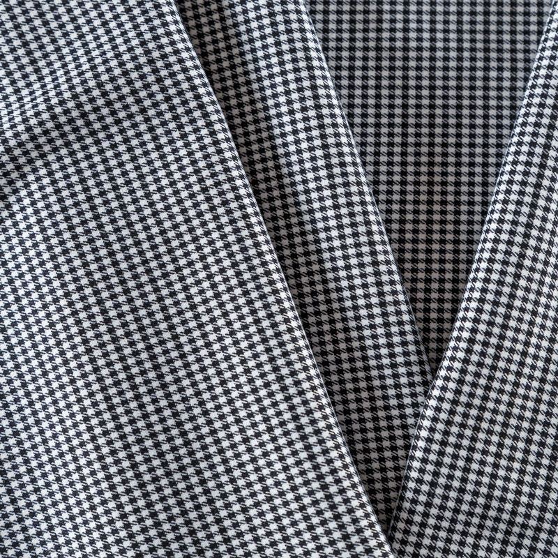 Костюмно-плательная ткань средней плотности с добавлением вискозы. Мягкая, пластичная, с мелким геометрическим принтом - гусиная лапка в черно-белой гамме. Полотно очень приятное на ощупь, не мнется, не сухое, отлично драпируется. Идеально подойдет для костюма, жакета или жилета, брюк, а также юбок и платьев.