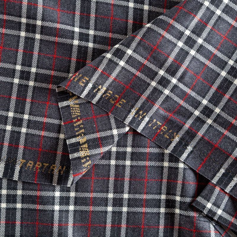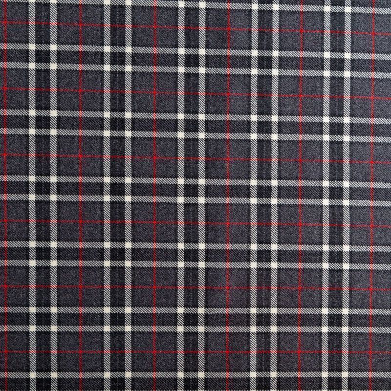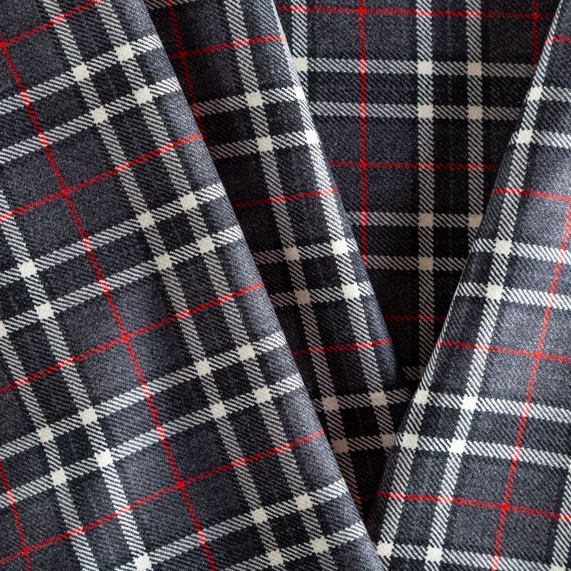 Итальянская костюмная шерсть средней плотности, мягкая и приятная на ощупь, формоустойчива, хорошо драпируется и образует мягкие складки. Сочетание линий графитового, красного и белого цветов образует сложную красивую клетку тартан. Ткань отлично подойдет на костюмы, юбки, брюки, платья, жакеты, для школьной формы.