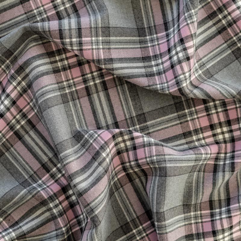 Плотная, но мягкая и приятная на ощупь костюмно-плательная шотландка, немного тянется, формоустойчива, не мнется, хорошо драпируется и образует мягкие складки. Сочетание линий черного, розового и белого цветов образует сложную красивую клетку. Ткань отлично подойдет на костюмы, юбки, брюки, платья, жакеты, для школьной формы.