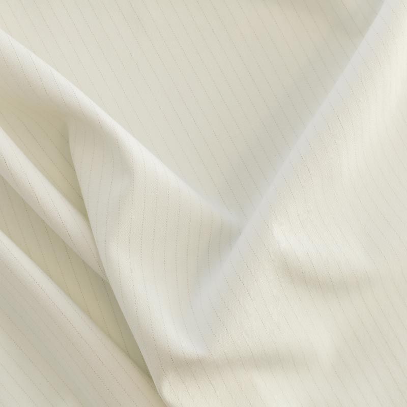 Достаточно плотная костюмно-плательная ткань, мягкая и приятная на ощупь, немного тянется, формоустойчива, хорошо драпируется и образует мягкие складки. Элегантный молочный цвет ткани украшает тончайшая золотистая люрексная вертикальная полоска. Ткань отлично подойдет на костюмы, юбки, брюки-палацио, платья, жакеты.