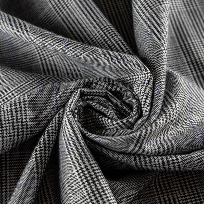 Ткань средней плотности, легкая и мягкая, приятная на ощупь, немного эластичная, хорошо драпируется и образует мягкие складки. Сочетание линий серого, молочного оттенков и принта "гусиная лапа" образует сложную красивую клетку. Монохромный строгий принт разбавляет еле уловимая элегантная тонкая толоска фиолетового цвета. Ткань отлично подойдет на костюмы, юбки, брюки, платья, жакеты.