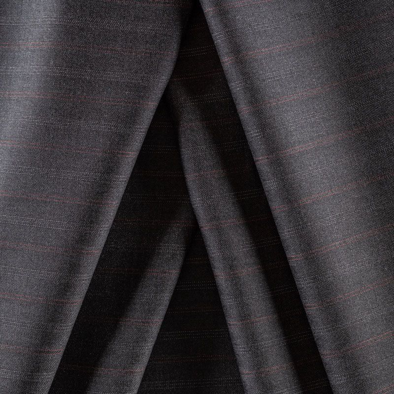 Костюмно-плательная шерстяная ткань средней плотности, немного суховата, приятная на ощупь. На темно-сером фоне очень тонкая жаккардовая полоска серого и бордового оттенка, направление - вдоль кромки. Прекрасно подойдет для пошива брюк-палацио, жакета, платья по фигуре, сарафана, классического мужского или женского костюма.