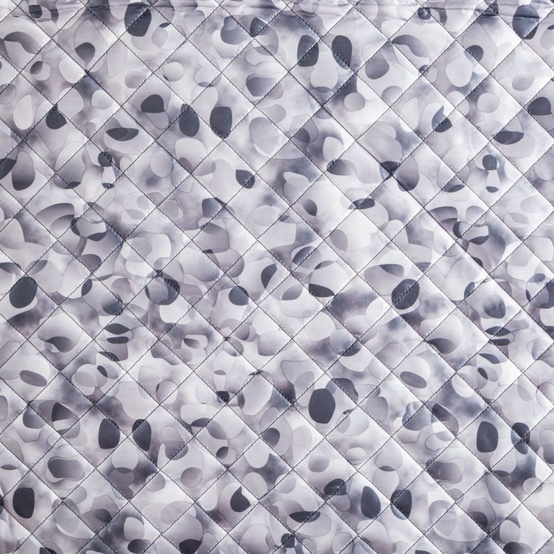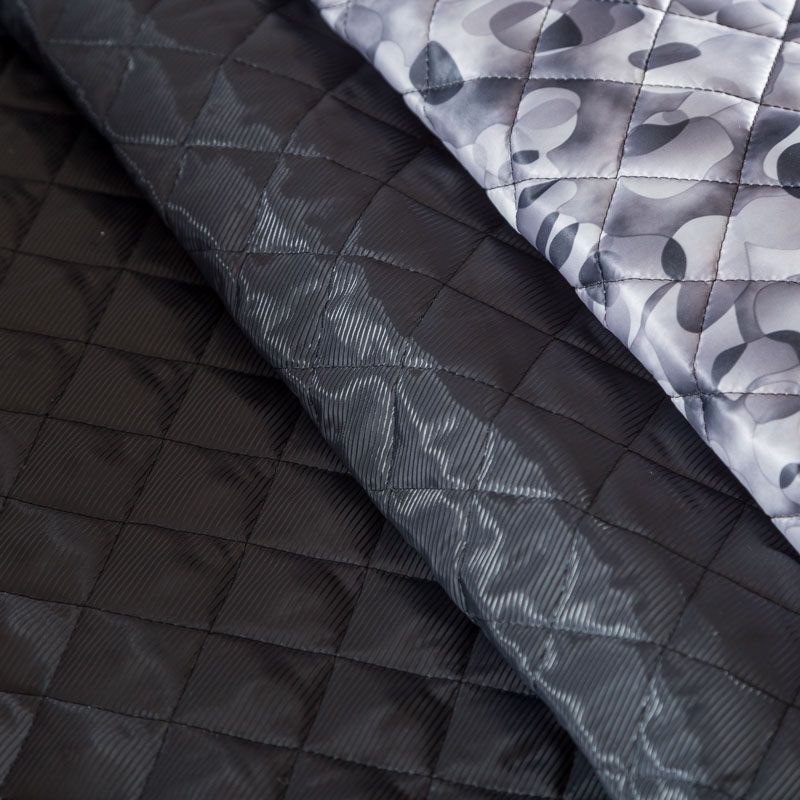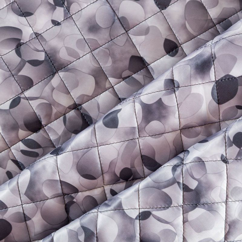 Трехслойная итальянская курточная ткань серого оттенка с абстрактным принтом, простеганная не крупными ромбами. Нижний, черного цвета, заменяет подклад и верхний слой - полиэстер, по качеству напоминает болонь, между ними синтепон. Ткань легкая, пластичная, хорошо драпируется. Прекрасно подойдет для  пошива легких пальто, курток, бомберов, жилетов, накидок-кейпов, объемных сумок, одежды для домашних питомцев, туристического снаряжения.