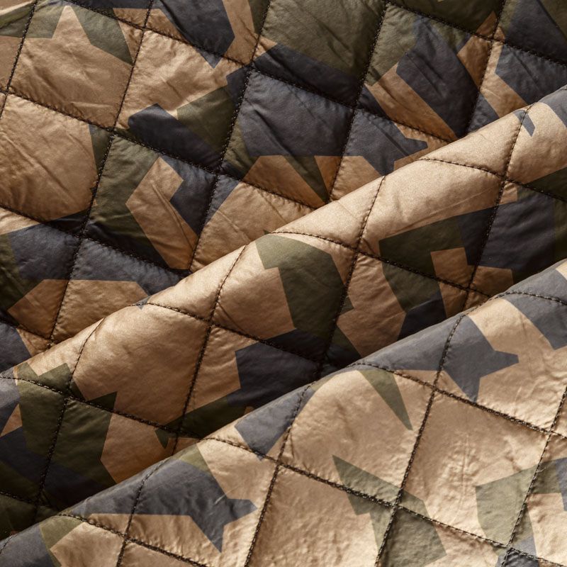 Двухслойная курточная ткань золотистого цвета с геометрическим принтом в зелено-черной гамме, простеганная не крупными ромбами размером 4х4 см. Нижний слой - синтепон, верхний - полиэстер, по качеству напоминает болонь. Очень мягкая и легкая, пластичная, хорошо драпируется. Прекрасно подойдет для пошива легких пальто, курток, жилетов, накидок-кейпов, объемных сумок.