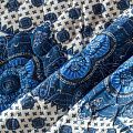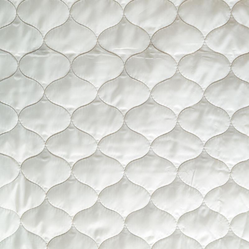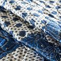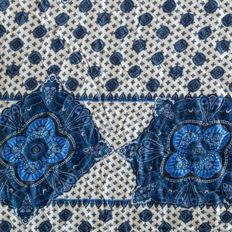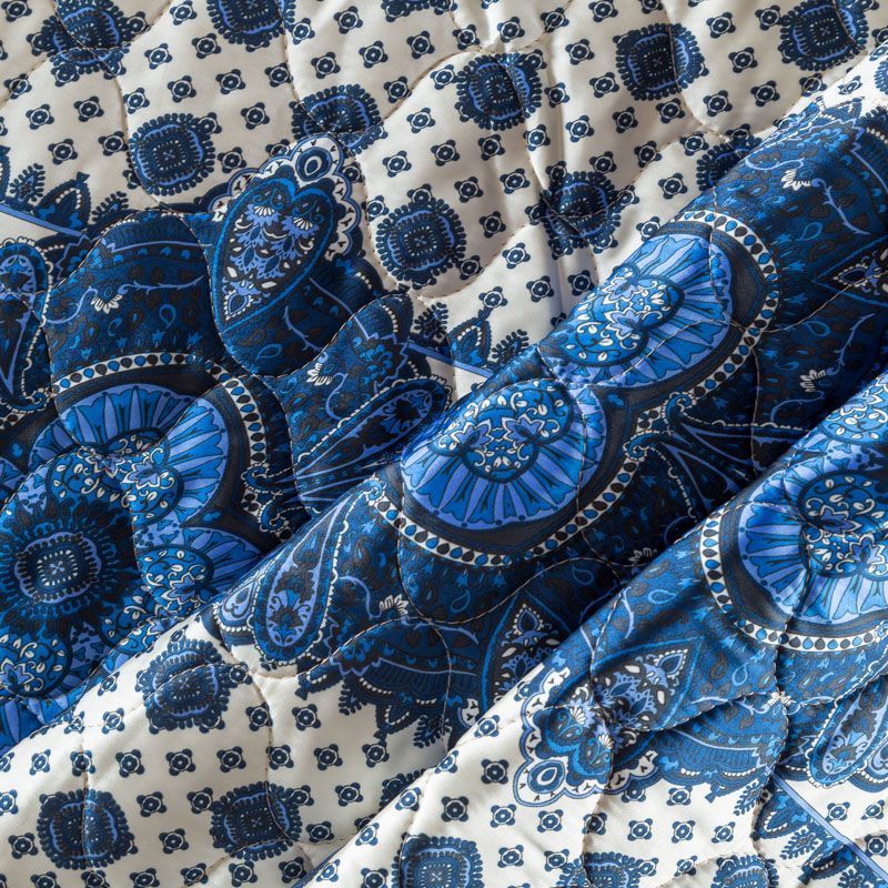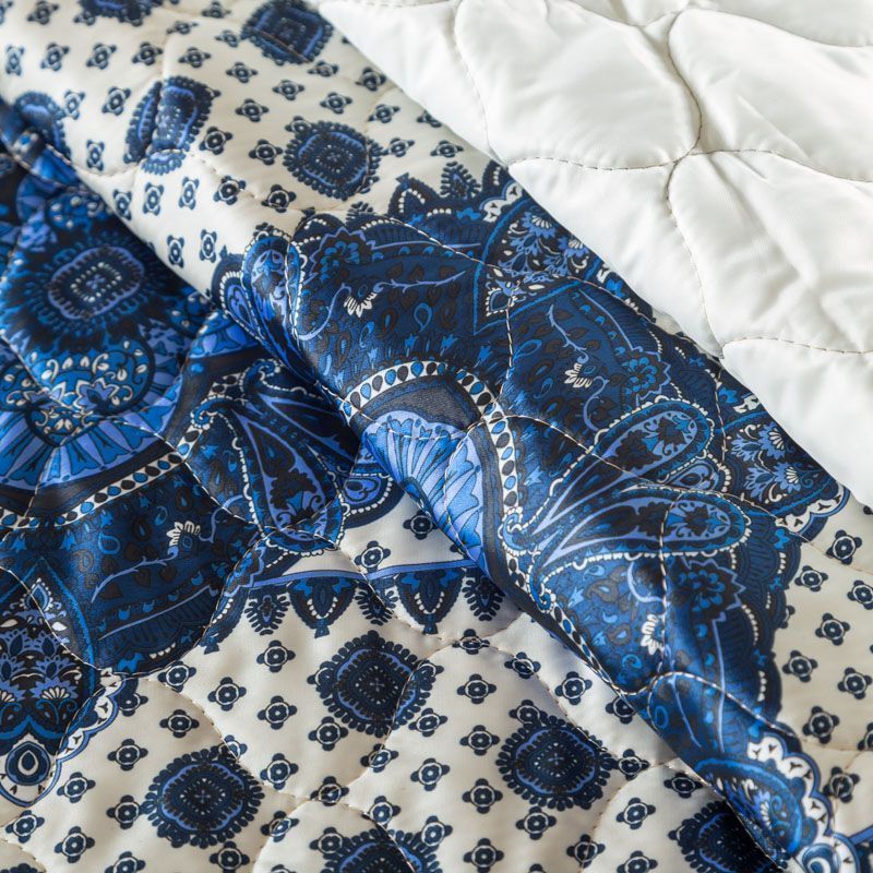 Трехслойная итальянская курточная ткань светлого оттенка со красивым узором в синих цветах, простеганная фигурными линиями. Нижний слой молочного цвета, средний слой - синтепон, верхний слой - принтованный матовый полиэстер. Ткань легкая, пластичная, хорошо драпируется. Прекрасно подойдет для  пошива легких пальто, курток, бомберов, жилетов, накидок-кейпов, объемных сумок, одежды для домашних питомцев, туристического снаряжения.