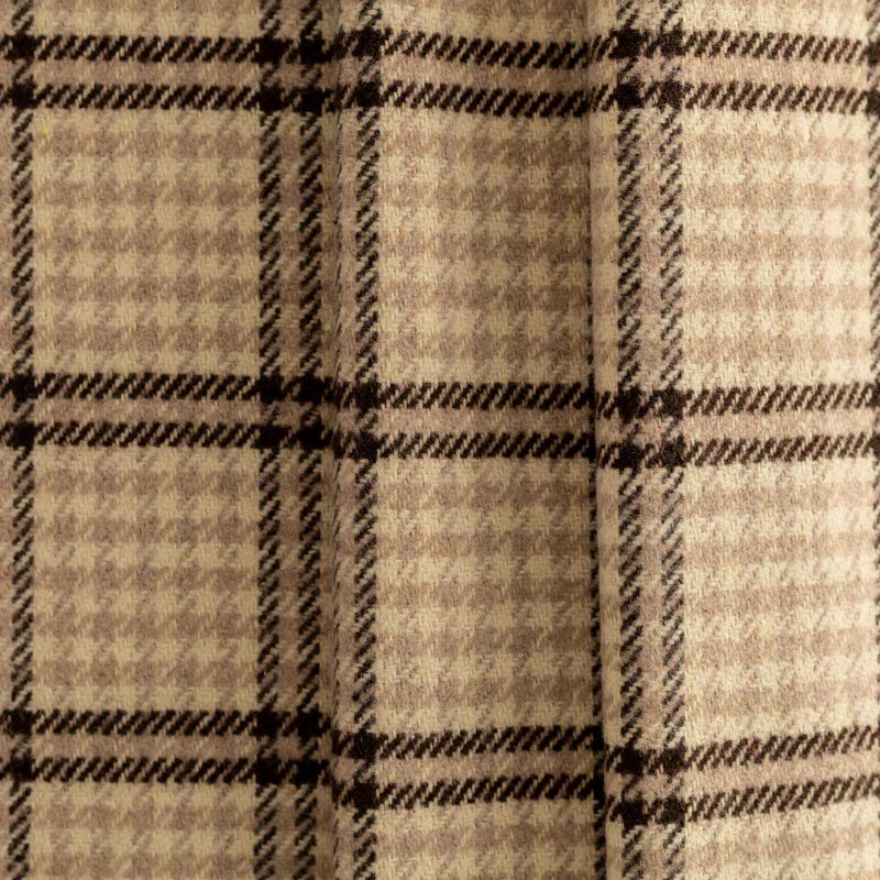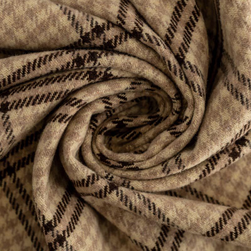Стильная и элегантная пальтовая ткань с светлых тонах. Поверхность бархатистая, мягкая, очень приятная на ощупь, пластичная, мягко драпируется в складки, немного держит форму. Сочетание линий коричневого, карамельного оттенков и классического узора "гусиная лапка" образует сложную красивую клетку. Отлично подойдет для пошива пальто, теплых костюмов, юбки, шорт, жакета, кейпа, жилета.