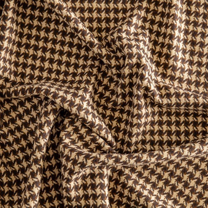 Плотная пальтовая ткань с добавлением вискозы песочного оттенка в коричневую куриную лапку, мягкая и приятная на ощупь, формоустойчива, хорошо драпируется. Ткань отлично подойдет для пошива пальто, теплых костюмов, юбки, шорт, жакета, кейпа, жилета.