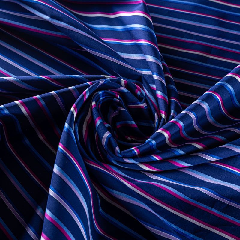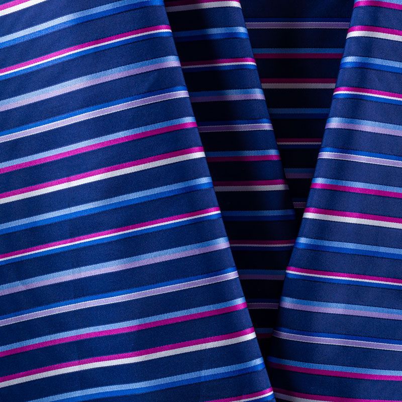 Итальянский плательно-рубашечный хлопок синего оттенка в тонкую полоску голубого, белого и ярко-розового цвета. Ткань мягкая, лёгкая, непрозрачная, пластичная и приятная к телу, хорошо драпируется, имеет гладкую матовую поверхность и сатиновое плетение. Прекрасно подойдет как для пошива платья-рубашки, сарафана, платьев различных фасонов, туники, топа, летнего костюма, комбинезона.