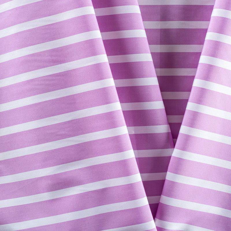 Итальянский плательно-рубашечный хлопок сиреневого цвета в белую полоску средней ширины. Ткань мягкая, лёгкая, непрозрачная, пластичная и приятная к телу, хорошо драпируется, имеет гладкую матовую поверхность и сатиновое плетение. Прекрасно подойдет как для пошива платья-рубашки, сарафана, платьев различных фасонов, туники, топа, летнего костюма, комбинезона.