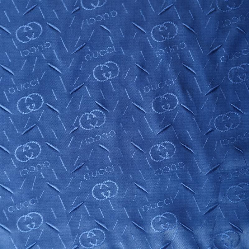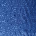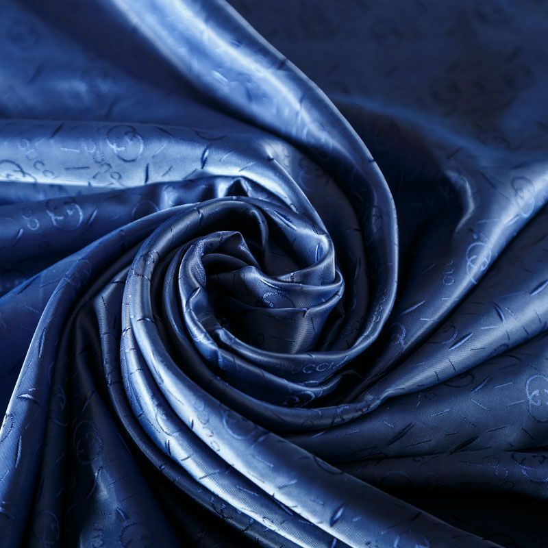 Смесовая подкладочная ткань синего оттенка с жаккардовым узором и красивым лоском. Полотно средней плотности, легкое, не просвечивает, хорошо скользит, не тянется. Подойдет для изготовления таких изделий, как пальто, костюмы, куртка, шуба, платье, жакет.