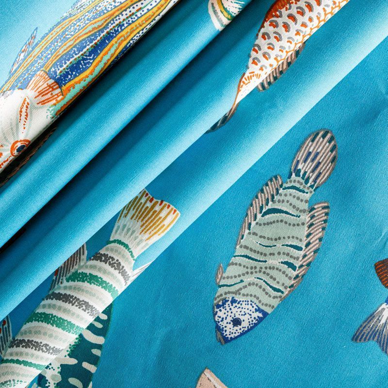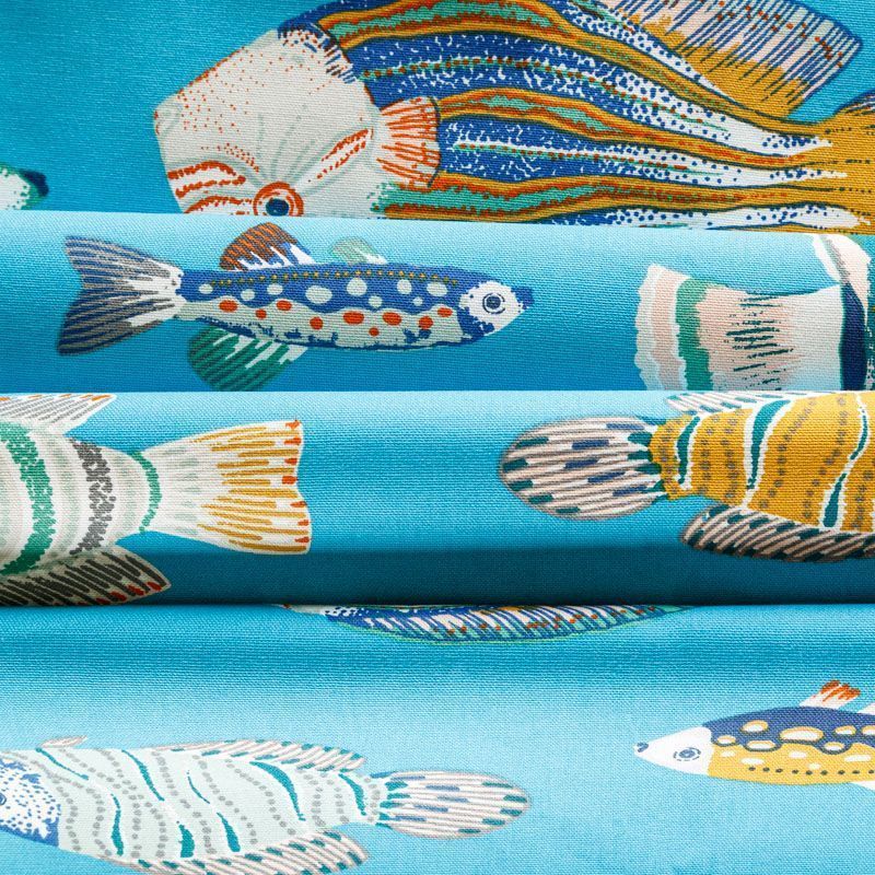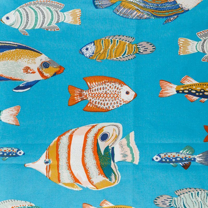 Матовая фактурная портьерная ткань лазурно-голубого оттенка с цветными яркими тропическими рыбками. Ткань средней плотности, без блеска, хорошо драпируется, имеет полонтяное переплетение. Прекрасно впишется в самые разные стилевые направления (прованс, кантри). Можно использовать для пошива портьер, римской шторы, салфеток, столового белья, подушек, покрывал и других предметов текстильного интерьера.