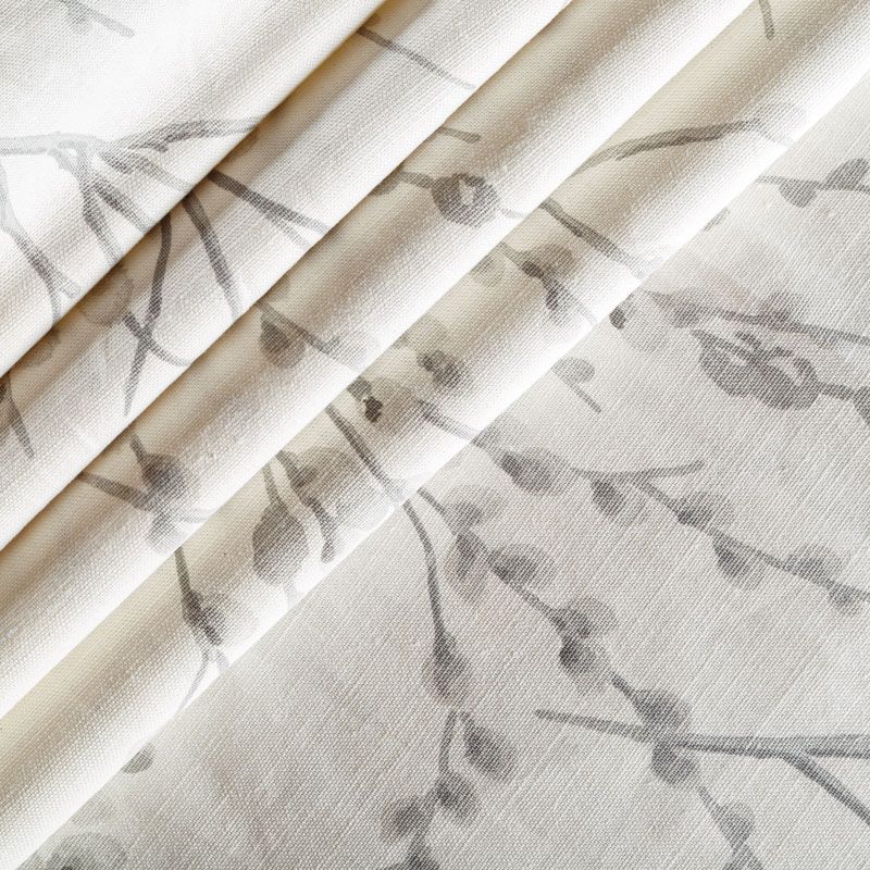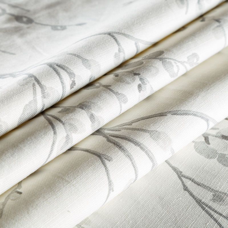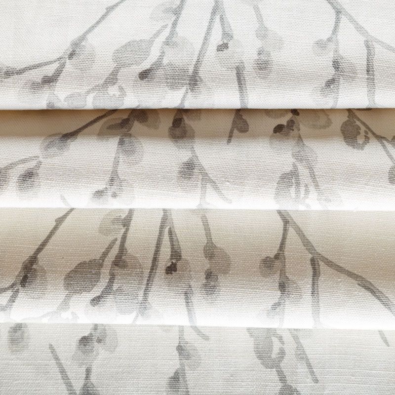 Хлопковая портьерная ткань с изящным весенним принтом в серых оттенках на светлом теплом фоне. Ткань средней плотности, без блеска, хорошо драпируется, имеет полонтяное переплетение. Можно использовать для пошива портьер, римской шторы, салфеток, столового белья, подушек, покрывал и других предметов текстильного интерьера.