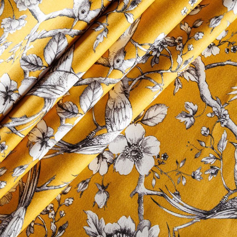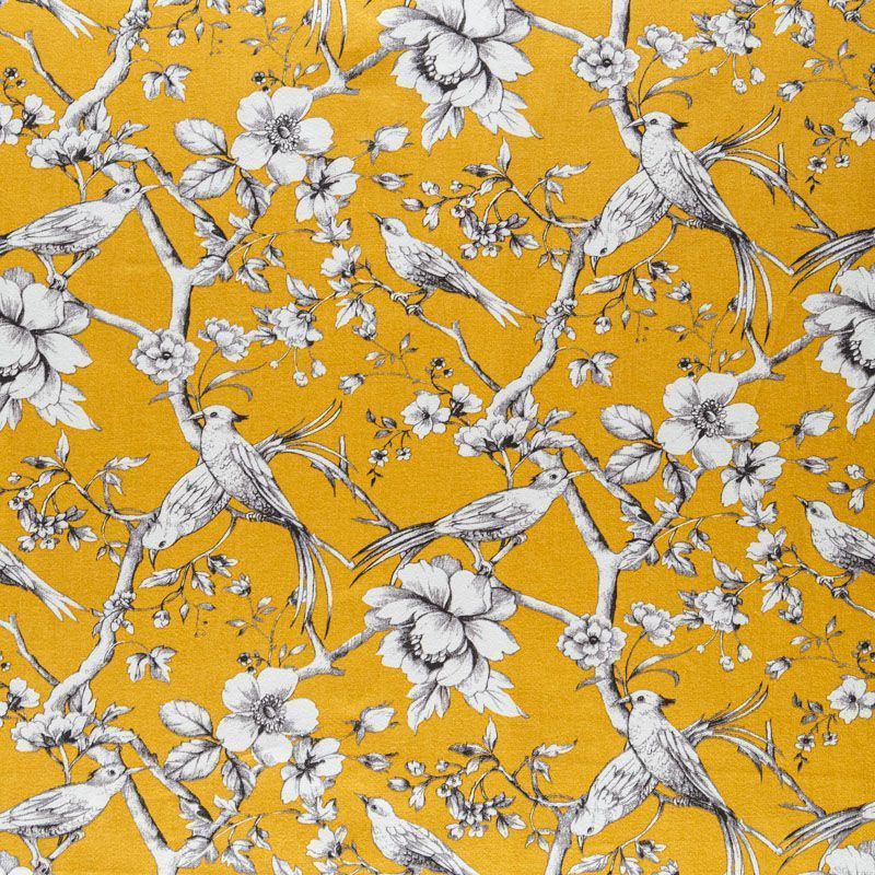 Хлопковая портьерная ткань от английского производителя. На  текстурированной основе цвета охры наснесен принт в виде белых птиц и цветов. Ткань средней плотности, прекрасно держит форму, драпируется в устойчивые складки. Подойдет для классических портьер, римских штор, покрывал, подушек, скатертей, салфеток и других элементов текстильного интерьера как в самостоятельном исполнении, так и качестве компаньона к однотонным варинтам.