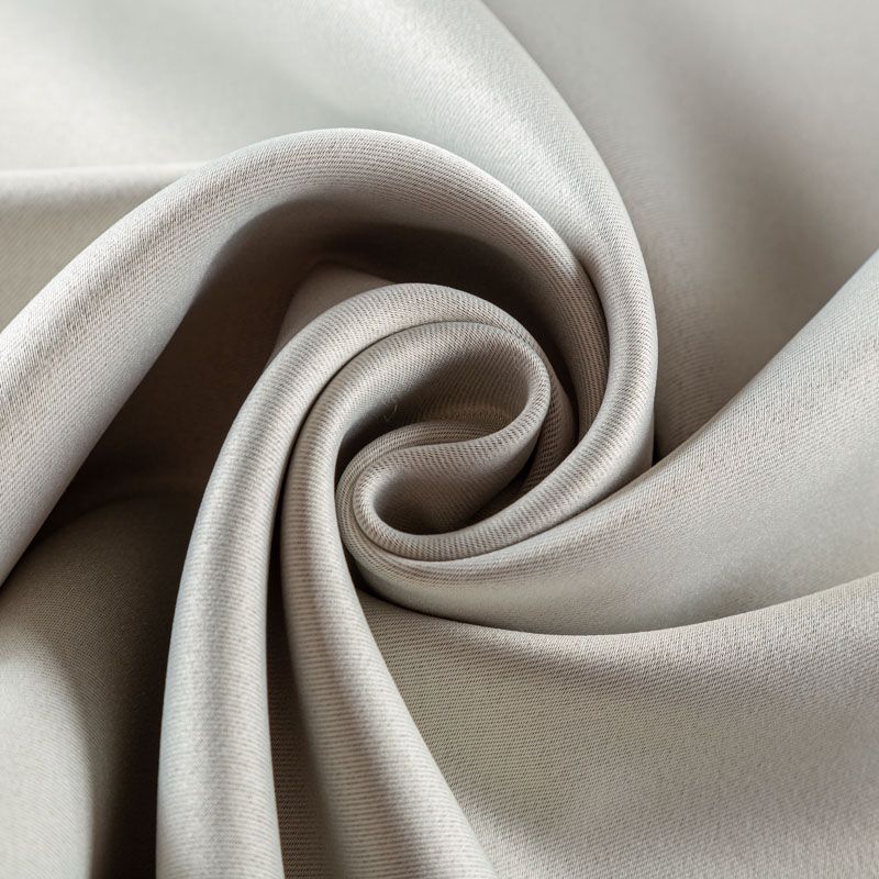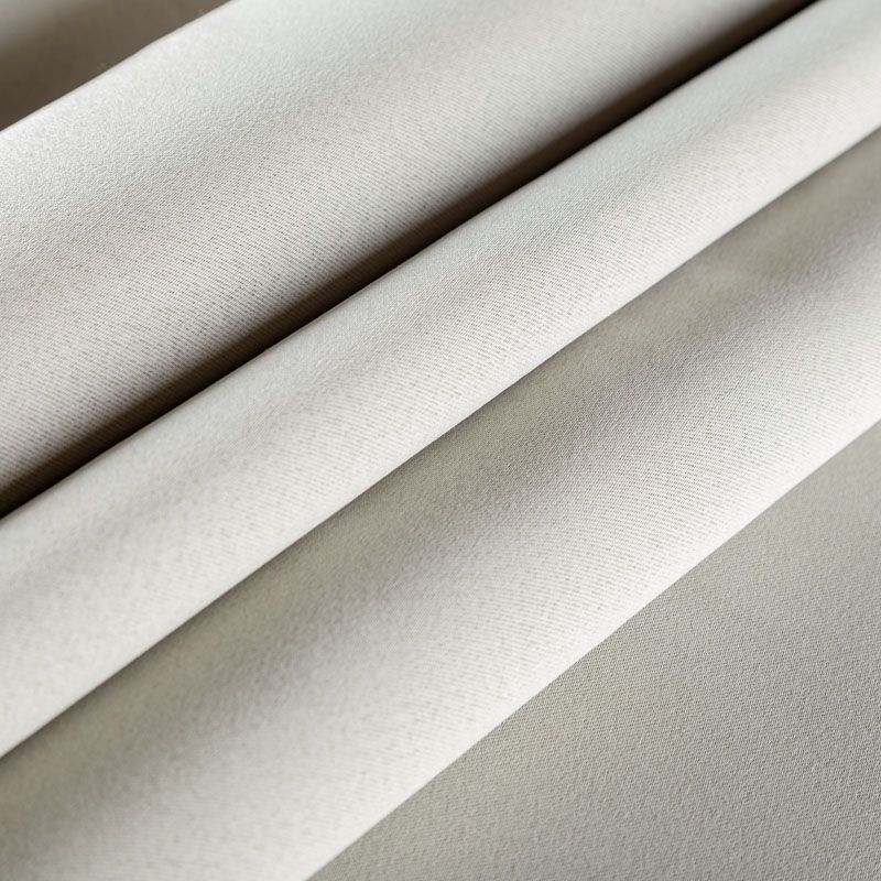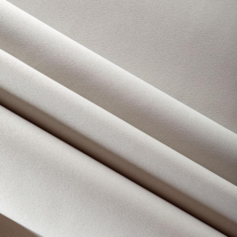Двухстороняя плотная ткань. Обе стороны гладкие, имеют сатиновый легкий глянец. Ткань хорошо драпируется, укладываясь в крупные ниспадающие пластичные складки и позволяет использовать любые виды крепления для штор – люверсы, ленту, кольца.  Блокирует от 30 до 70 % проникновение света в помещении, не склонна к выгоранию и деформации. Удачно впишется в такие интерьеры, как эко, лофт, модерн в качестве портьер и других элементов текстильного оформления.