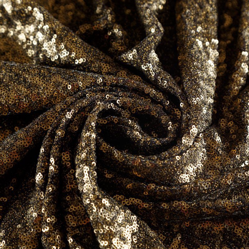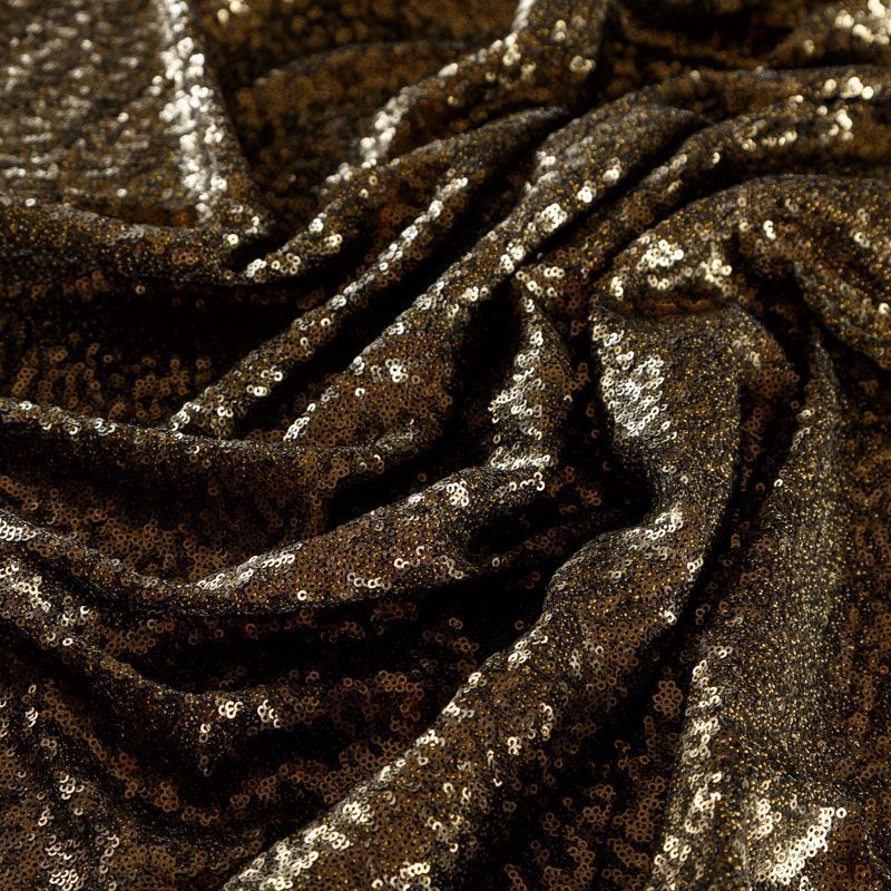 Мелкие пайетки бронзового оттенка на плотной сетчатой основе. Ткань хорошо драпируется, красиво переливается, имеет глянцевый блеск. Немного тянется, благодаря чему изделия получаются комфортными и отлично сидят по фигуре. Пайетки — идеальный материал для праздников и вечеринок. Из них получится эффектное платье, туника, юбка или комбинезон.