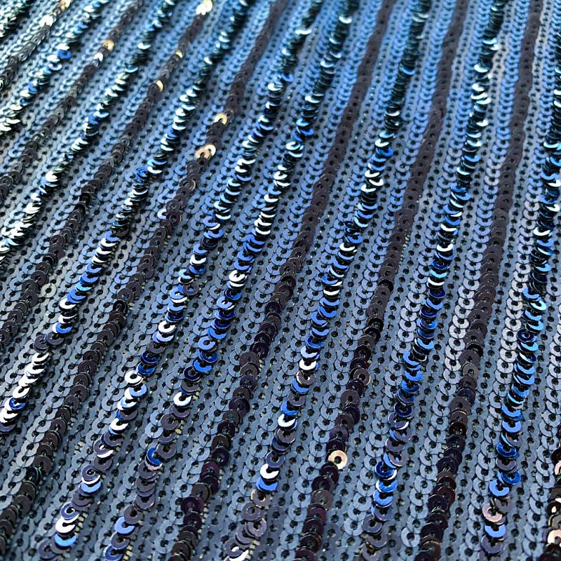 Пайетки на плотной сетчатой основе в тонкую чередующуюся полоску глянцевых и матовых блесток. Полоска расположена поперек полотна. Ткань хорошо драпируется, красиво переливается, имеет глянцевый блеск. Немного тянется, благодаря чему изделия получаются комфортными и отлично сидят по фигуре. Пайетки — идеальный материал для праздников и вечеринок. Из них получится эффектное платье, туника, юбка или комбинезон.
