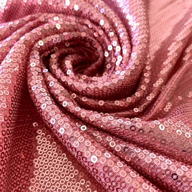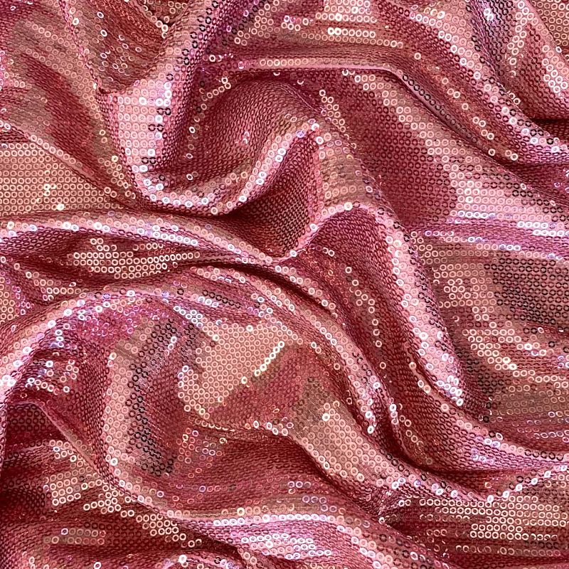 Блестящие пайетки ярко-розового оттенка. Мелкие, размером около 2 мм. Основа - "холодное" тонкое трикотажное полотно, комфортное в носке. Ткань не прозрачная, тянется.  Подойдет для вечернего коктельного платья или юбки, комбинезона, топа, танцевальных и сценических костюмов.