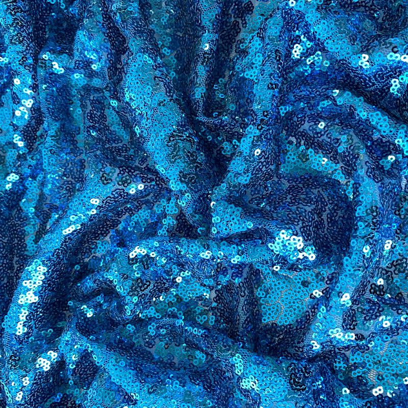Блестящие пайетки ярко-голубого оттенка. Мелкие, размером около 3 мм, расположены в хаотичном порядке. Основа - мягкая и эластична сетка.  Ткань полупрозрачная, может потребоваться подклад. Подойдет для вечернего платья, юбки, нарядных детских изделий, танцевальных и сценических костюмов.