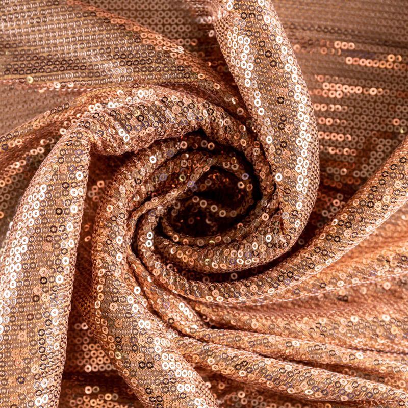 Блестящие пайетки бронзового оттенка. Мелкие, размером около 3 мм. Основа - трикотажное полотно, комфортное в носке. Ткань не прозрачная, тянется.  Подойдет для вечернего коктельного платья или юбки, комбинезона, топа, танцевальных и сценических костюмов.