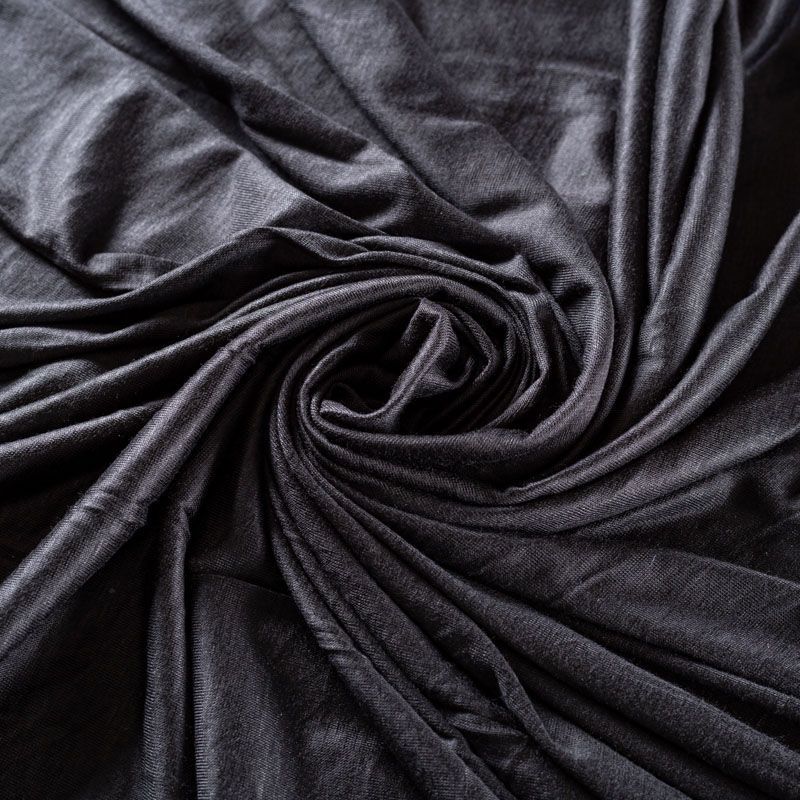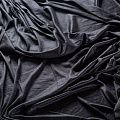 Тонкий хлопковый трикотаж черного цвета с легким блеском на поверхности, который особенно эффектно смотрится в драпировке. Материал не просвечивает, приятный к телу и комфортный в носке. Подойдет для пошива топов, футболки, бадлонов, лонгслива, кардигана, спортивного платья.