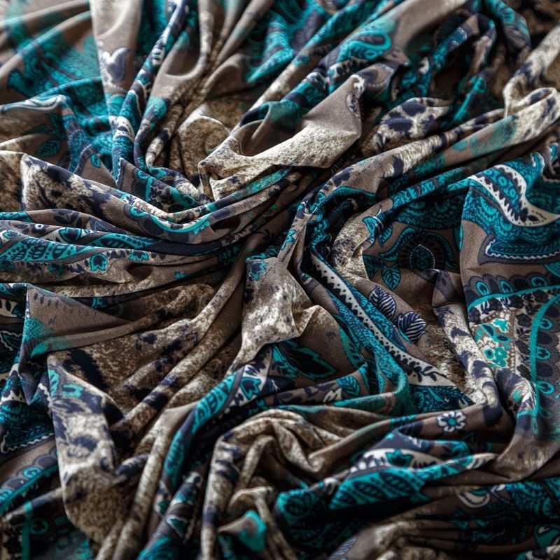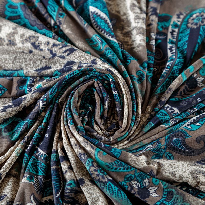"Холодный" трикотаж с бирюзовым узором пейсли, средней плотности, хорошо тянется за счет эластана в составе. Ткань не сухая, мягкая, не просвечивает, хорошо драпируется. Отлично подойдет для пошива платья, туники, лонгслива, топа, юбки.