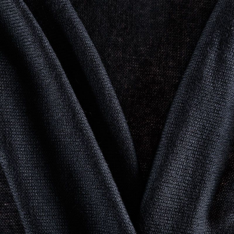 Итальянский шерстяной вязаный трикотаж черного цвета средней плотности и прозрачности. Ткань легкая, мягкая, не колется, приятная на ущупь, уютная и теплая. Идеально подойдет для пошива водолазки, свитера, кардигана, а также для шарфа, снуда.