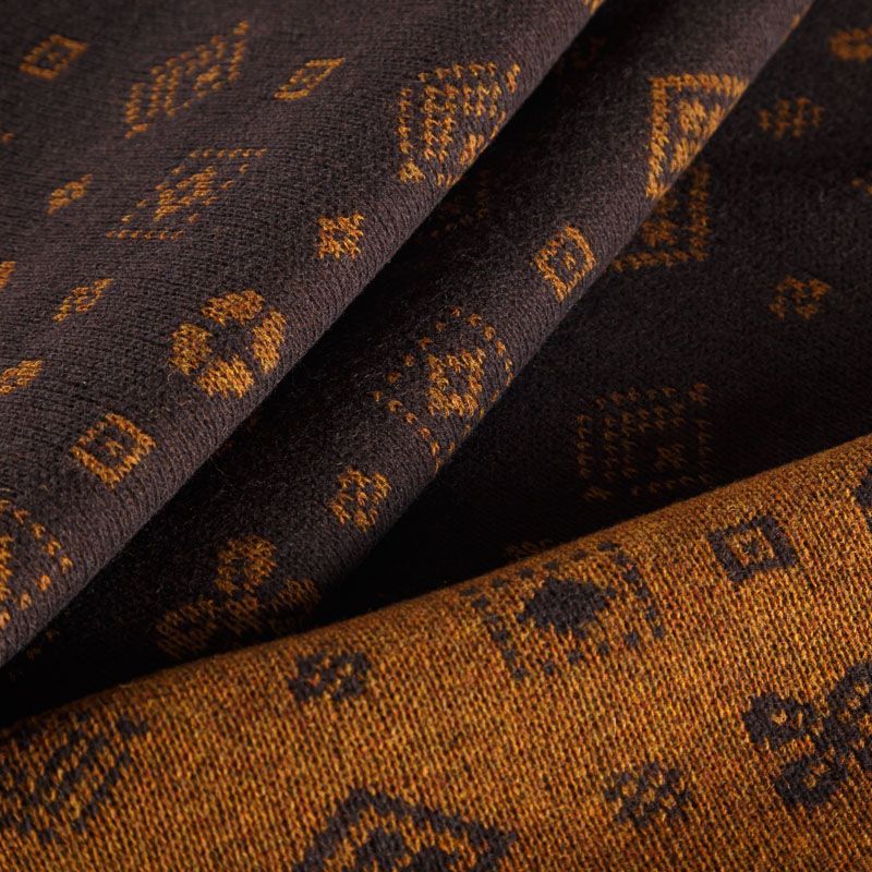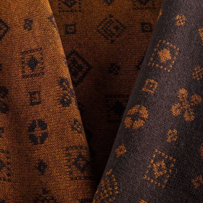 Итальянский теплый мягкий вязаный шерстяной трикотаж, два слоя которого соединены между собой жаккардовым геометрическим узором. Полотно очень пластичное, приятное на ощупь, не колется. При соответствующей обработке швов одежду из этого трикотажа можно носить на обе стороны. Подойдет для пошива теплых уютных свитеров, кардиганов, пальто, костюмов, теплого платья, свитшота, джемпера.