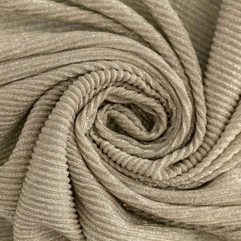 Легкая, слегка прозрачная ткань, с высокой степенью эластичности, поверхность рельефная за счет эффекта гофре и мерцающая за счет напыленного люрекса. Идеальна для облегающих изделий с использованием подклада, платья, топа, юбки, брюк, кардигана. Полоски гофре расположены поперек кромки, набирается объемом.