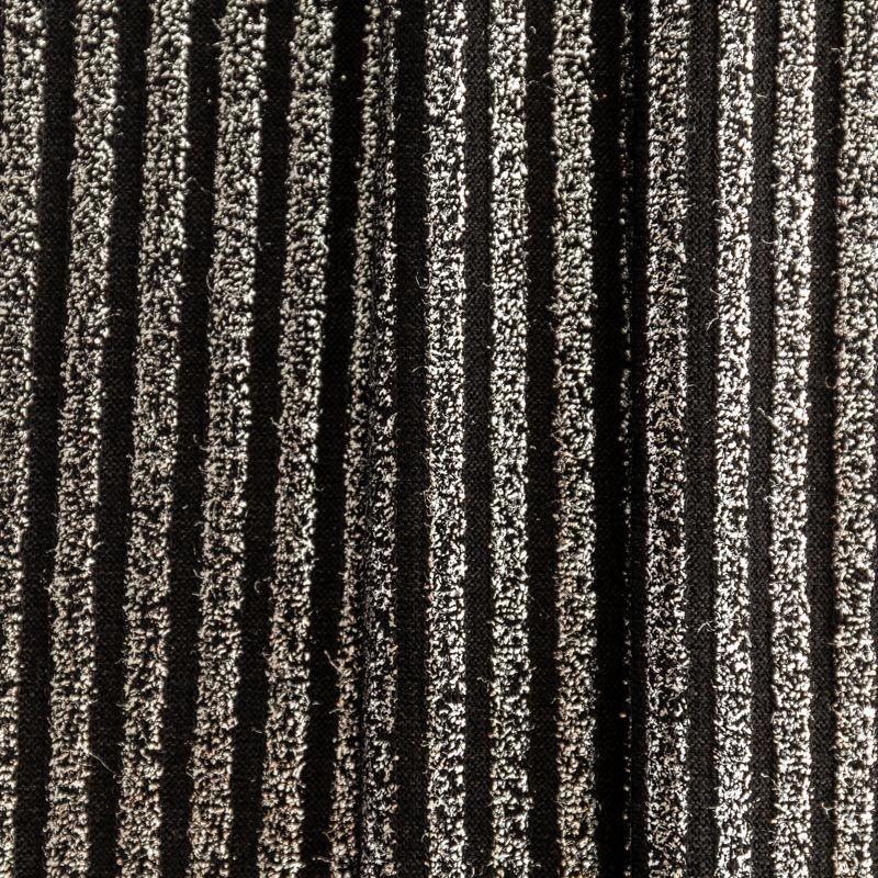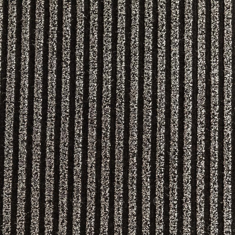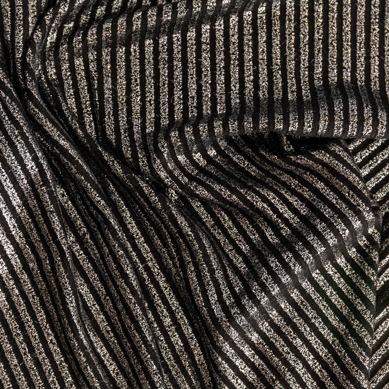 Трикотаж-лапша средней плотности, с высокой степенью эластичности, поверхность рельефная за счет эффекта резинки и мерцающая за счет металлизированного напыления. С изнанки трикотаж гладкий, комфортный, подходит для использования без подклада. Сшить из такого полотна можно водолазки, платья, топы, юбки, комплекты, нарядные изделия. Направление полос - вдоль линии кромки.