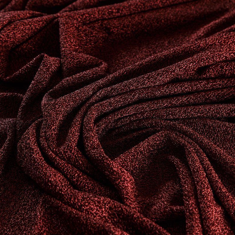 Трикотажное полотно с металлизированным блеском и  мерцанием. Люрексные нити бордового оттенка вплетены в структуру полотна и создают объемный "вспененный" эффект, при этом изнанка гладкая и ровная. Ткань очень приятная к телу, не колется, не просвечивается, очень эластичная, отлично драпируется и ниспадает, красиво ляжет по фигуре. Идеальный вариант для пошива вечерних и нарядных платьев облегающего силуэта, топов, комбинезона, юбки, широких брюк, туник, кардиганов, накидок.