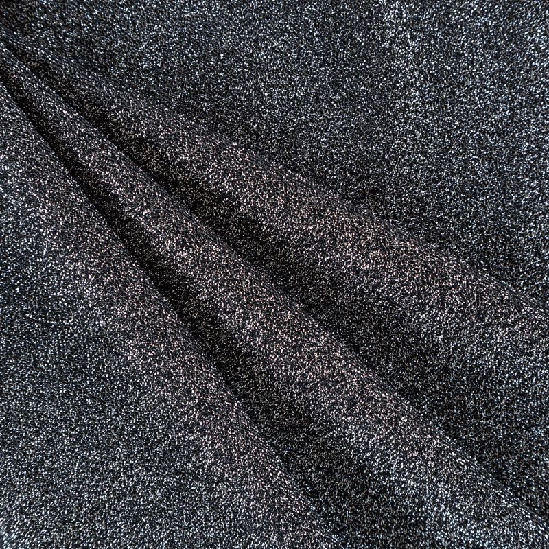 Трикотажное полотно с металлизированным блеском и  мерцанием. Люрексные нити вплетены в структуру полотна и создают объемный "вспененный" эффект, при этом изнанка гладкая и ровная. Ткань очень приятная к телу, не колется, не просвечивается, очень эластичная, отлично драпируется и ниспадает, красиво ляжет по фигуре. Идеальный вариант для пошива вечерних и нарядных платьев облегающего и свободного силуэта, топов, комбинезона, юбки, широких брюк, туник, кардиганов, накидок.