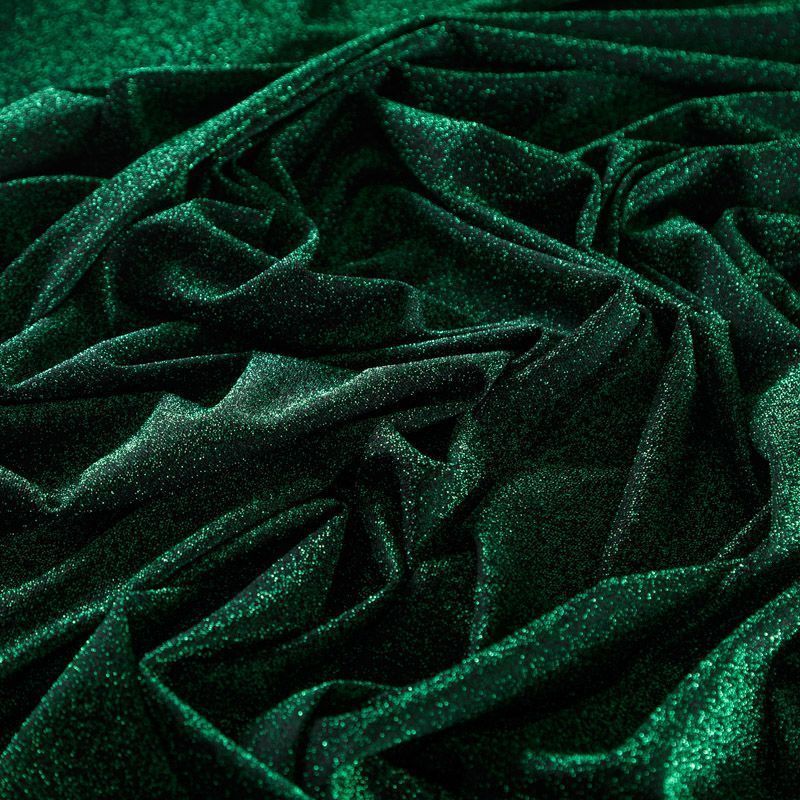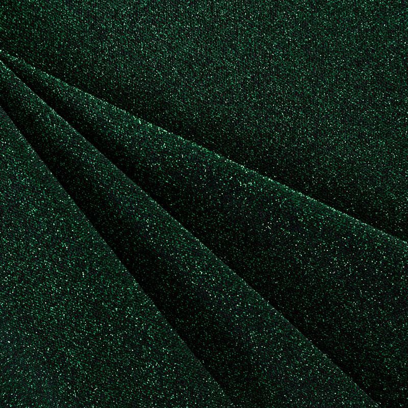 Трикотажное полотно с металлизированным блеском и  мерцанием. Люрексные нити зеленого оттенка вплетены в структуру полотна и создают объемный "вспененный" эффект, при этом изнанка гладкая и ровная. Ткань очень приятная к телу, не колется, не просвечивается, очень эластичная, отлично драпируется и ниспадает, красиво ляжет по фигуре. Идеальный вариант для пошива вечерних и нарядных платьев облегающего и свободного силуэта, топов, комбинезона, юбки, широких брюк, туник, кардиганов, накидок.