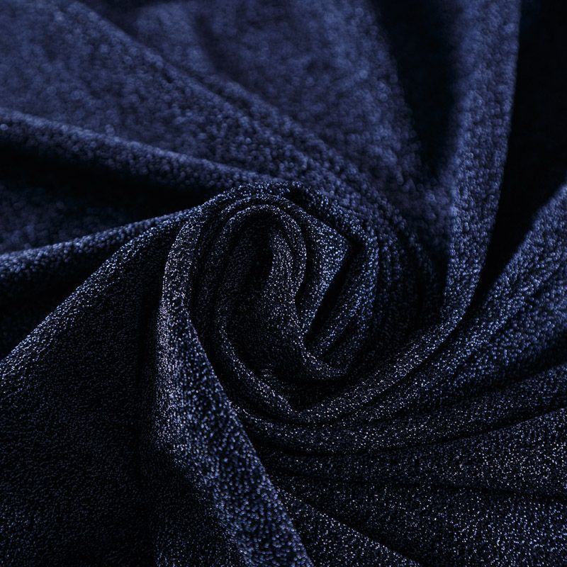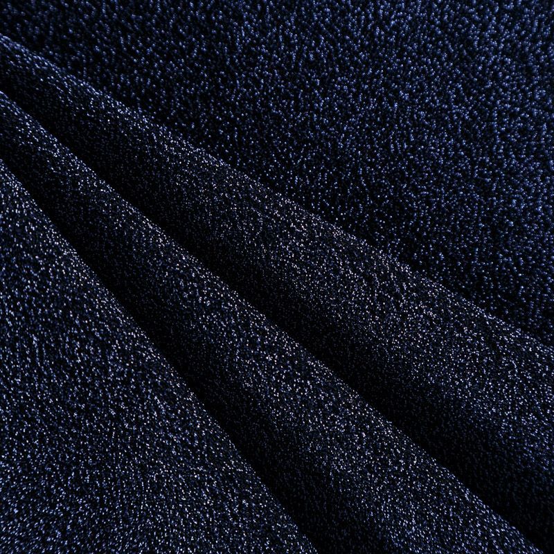 Трикотажное полотно с металлизированным блеском и  мерцанием. Люрексные нити синего оттенка вплетены в структуру полотна и создают объемный "вспененный" эффект, при этом изнанка гладкая и ровная. Ткань очень приятная к телу, не колется, не просвечивается, очень эластичная, отлично драпируется и ниспадает, красиво ляжет по фигуре. Идеальный вариант для пошива вечерних и нарядных платьев облегающего и свободного силуэта, топов, комбинезона, юбки, широких брюк, туник, кардиганов, накидок.