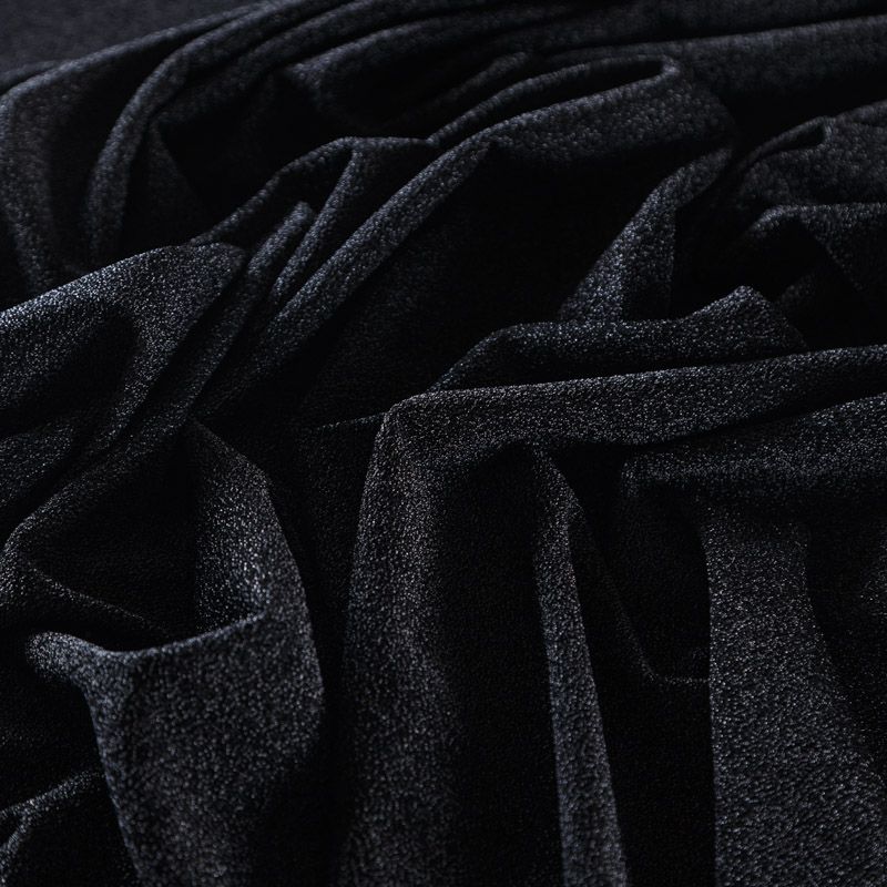 Трикотажное полотно с металлизированным блеском и  мерцанием. Люрексные нити вплетены в структуру полотна и создают объемный "вспененный" эффект, при этом изнанка гладкая и ровная. Ткань очень приятная к телу, не колется, не просвечивается, очень эластичная, отлично драпируется и ниспадает, красиво ляжет по фигуре. Идеальный вариант для пошива вечерних и нарядных платьев облегающего и свободного силуэта, топов, комбинезона, юбки, широких брюк, туник, кардиганов, накидок.