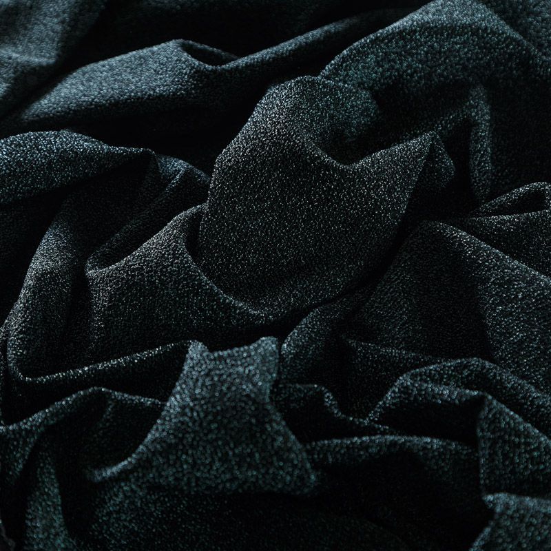 Трикотажное полотно с металлизированным блеском и  мерцанием. Люрексные нити зеленого оттенка вплетены в структуру полотна и создают объемный "вспененный" эффект, при этом изнанка гладкая и ровная. Ткань очень приятная к телу, не колется, не просвечивается, очень эластичная, отлично драпируется и ниспадает, красиво ляжет по фигуре. Идеальный вариант для пошива вечерних и нарядных платьев облегающего и свободного силуэта, топов, комбинезона, юбки, широких брюк, туник, кардиганов, накидок.