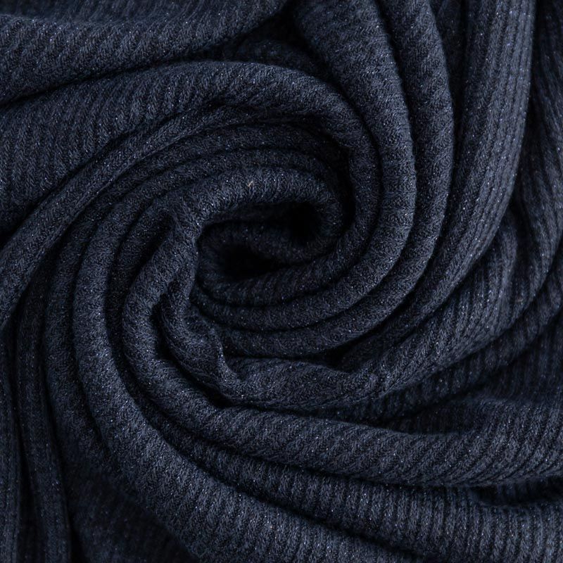 Трикотаж-лапша темно-синего цвета с люрексовой нитью. Мягкая и эластичная ткань, великолепно драпируется и красиво облегает. Прекрасно подходит для изделий по фигуре, а также нарядов с мягкими складками. Трикотаж можно использовать для вечерних образов — платья, блузки, топы, кардигана и боди.