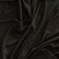 Трикотаж-лапша черного цвета с серебристой люрексовой нитью. Мягкая и эластичная ткань, великолепно драпируется и красиво облегает. Прекрасно подходит для изделий по фигуре, а также нарядов с мягкими складками. Трикотаж можно использовать для вечерних образов — платья, блузки, топы, кардигана и боди.