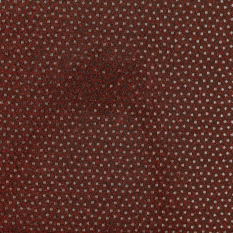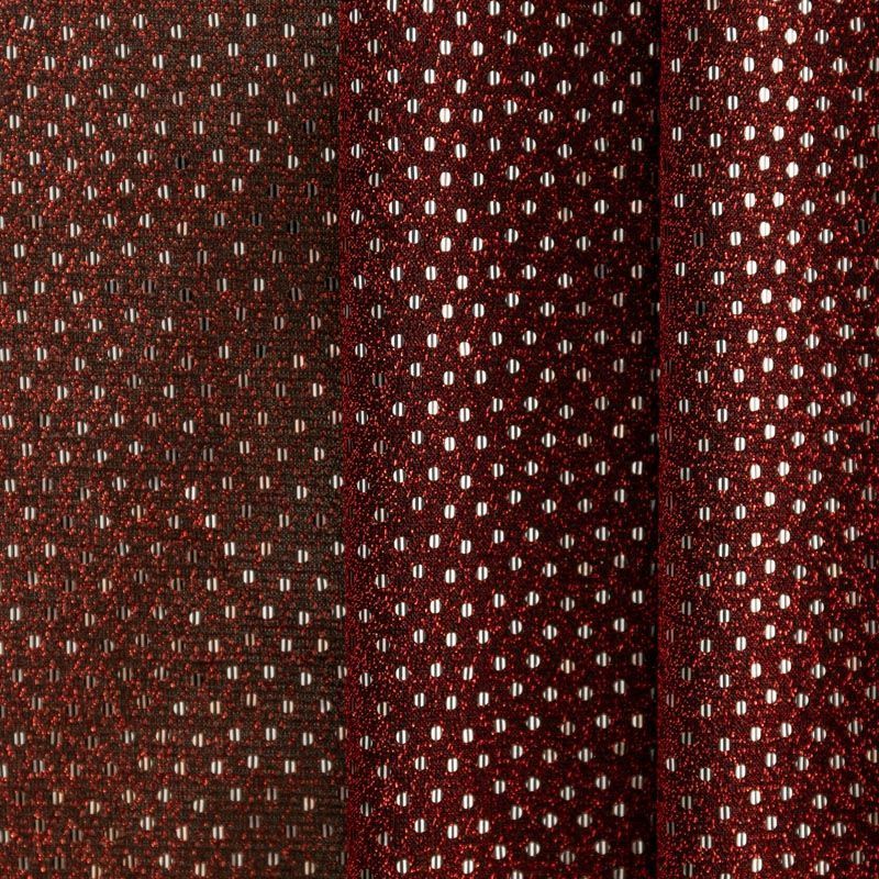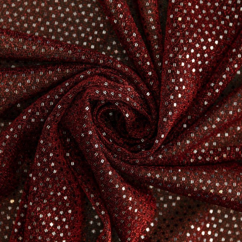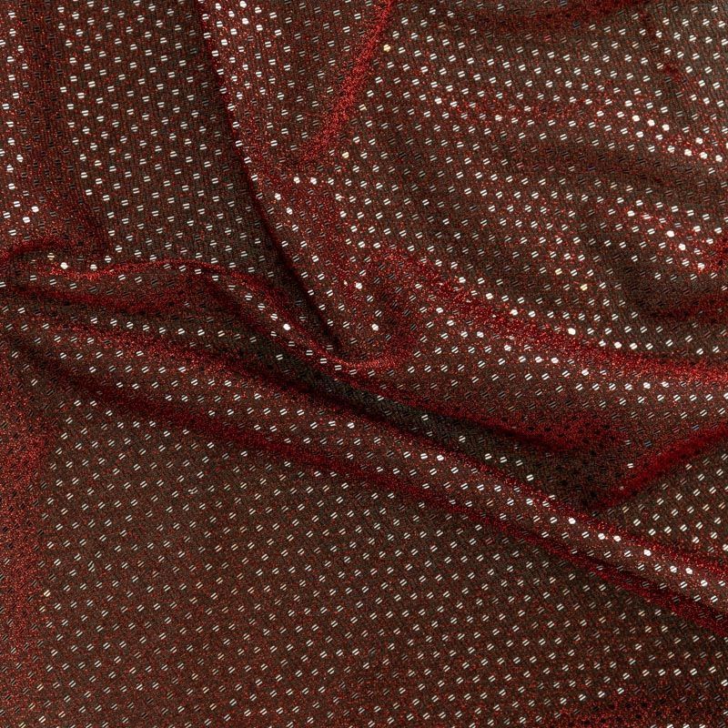 Трикотаж бордового цвета с красной люрексовой нитью и мелкими серебристыми пайетками. Мягкая и эластичная ткань, великолепно драпируется и красиво облегает. Тонкий, просвечивает, требуется подклад. Прекрасно подходит для изделий по фигуре, а также нарядов с мягкими складками. Трикотаж можно использовать для вечерних образов — платья, блузки, топы, кофточки и боди и для пошива танцевальных и сценических костюмов.