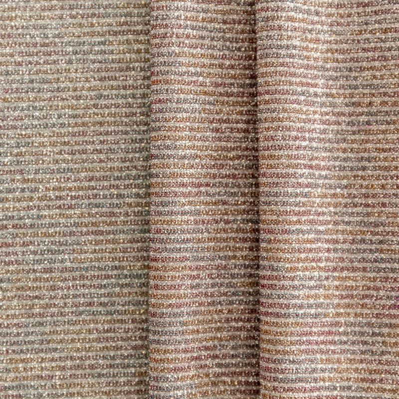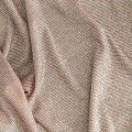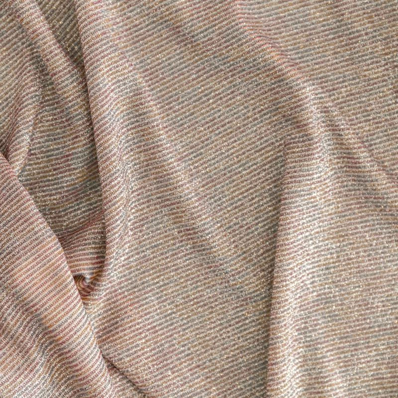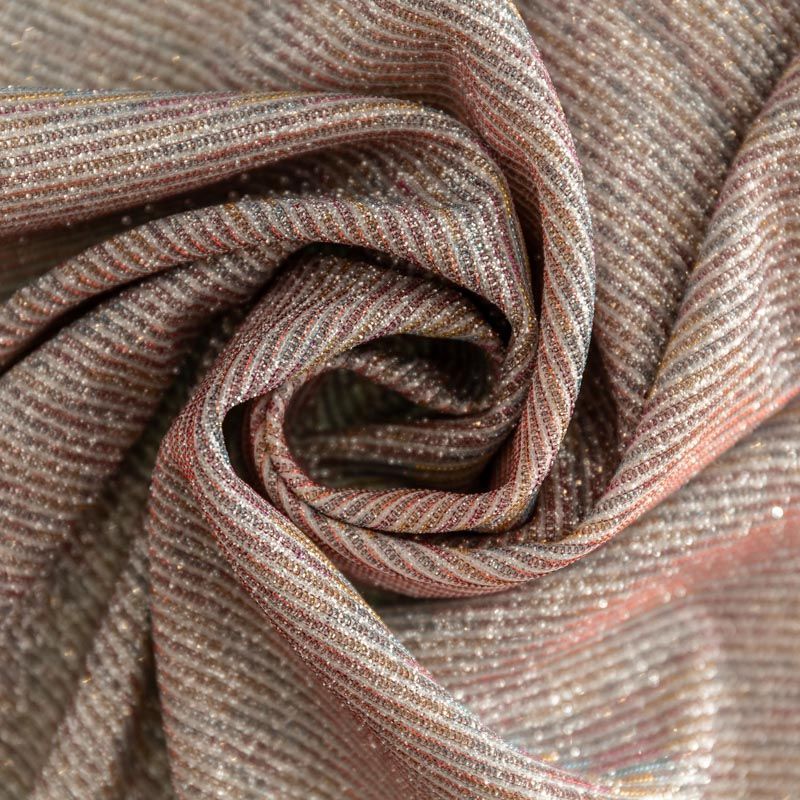 Мягкое и эффектное трикотажное полотно с металлизированным напылением. Структура полотна плотная, легко растяжимая, эластичная. С лицевой стороны поверхность ткани  слегка шероховатая на ощупь, характеризуется заметным блеском «металлик». С изнанки трикотаж гладкий, комфортный, подходит для использования без подклада. Отлично пододет для пошива водолазки, платья, топа, леггинсов, спортивных купальников, нарядных изделий.