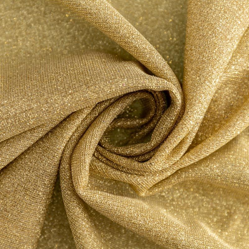Мягкое и эффектное трикотажное полотно с металлизированным напылением. Структура полотна плотная, легко растяжимая, эластичная. С лицевой стороны поверхность ткани  слегка шероховатая на ощупь, характеризуется заметным блеском «металлик». С изнанки трикотаж гладкий, комфортный, подходит для использования без подклада. Отлично пододет для пошива водолазки, платья, топа, леггинсов, спортивных купальников, нарядных изделий.