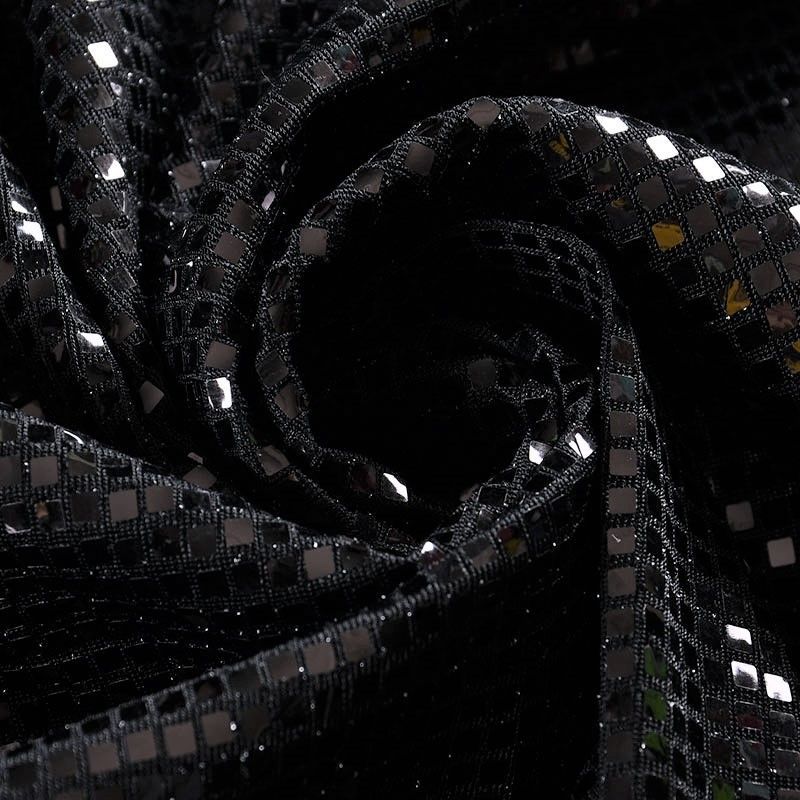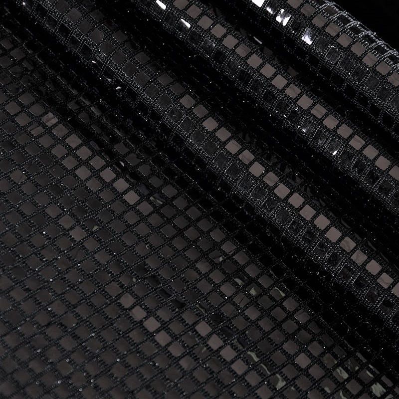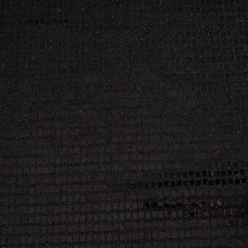Трикотажное черное полотно с блестящими глянцевыми черными квадратными пайетками. Декор накатан на основу, поэтому будет комфортен в носке. Ткань пластичная, прекрасно драпируется и укладывается в складки, легко садится по фигуре за счёт основы с эластаном, не прозрачная, позволит шить изделия без подклада. Идеально подойдет для пошива нарядных вечерних образов: платья, юбки, топа, туники, широких брюк, жакета, кардигана.