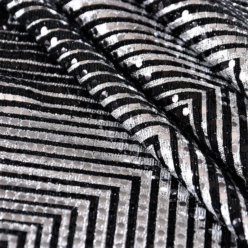 Трикотажное черное полотно серебристым геометрическим узором и деликатными прозрачными круглыми пайетками. Декор накатан на основу, поэтому будет комфортен в носке. Ткань пластичная, прекрасно драпируется и укладывается в складки, легко садится по фигуре за счёт основы с эластаном, не прозрачная, позволит шить изделия без подклада. Идеально подойдет для пошива нарядных вечерних образов: платья, юбки, топа, туники, широких брюк, жакета, кардигана.