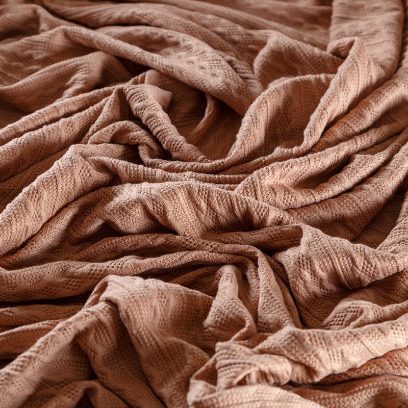 Текстурное вязаное, мягкое, пластичное полотно средней плотности в бежевом оттенке. Вязаный узор - стилизованая косичка с полосками расположен по всему полотну. Подойдет для пошива уютного свитера, кардигана, юбки, платья, водолазок, снудов и головных уборов.