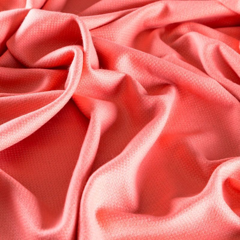 Итальянский шерстяной твид в коралловом оттенке. Ткань имеет жаккардовую повехность, средней плотности, в меру объемная с легким эффектом букле из нитей того же цвета, которые образуют мелкий геометрический узор. Твид мягкий, пластичный, умеренно держит форму, прекрасно подойдет для пошива жакетов на подкладке, жилетов, кардиганов, легких пальто, юбок и платьев.